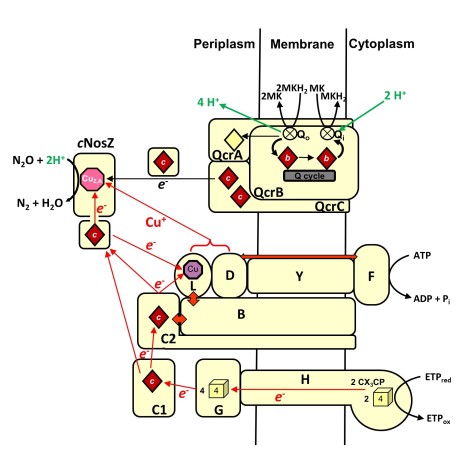 The terminal reductase of W. succinogenes nitrous oxide respiration is a cytochrome c nitrous oxide reductase (cNosZ) that belongs to the so-called clade II of NosZ enzymes. We presented evidence that functional N2O respiration involves a menaquinol-oxidizing Rieske/cytochrome bc complex and various Nos proteins encoded in the nos gene cluster. Furthermore, transcriptome analysis suggested that N2O-grown W. succinogenes cells specifically regulate gene expression in response to nitrous oxide.